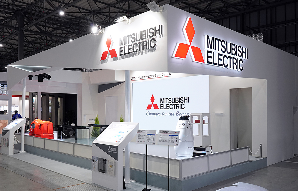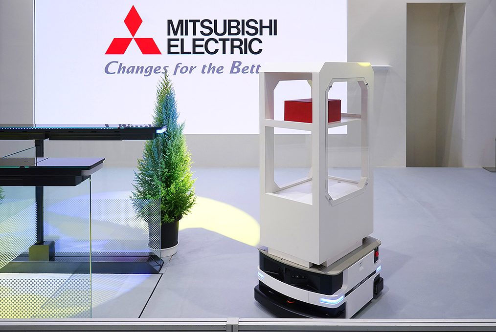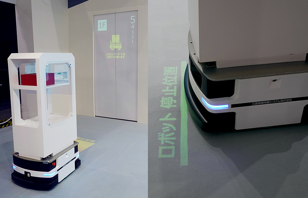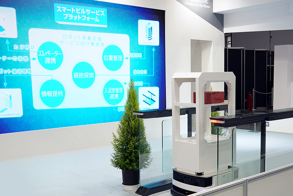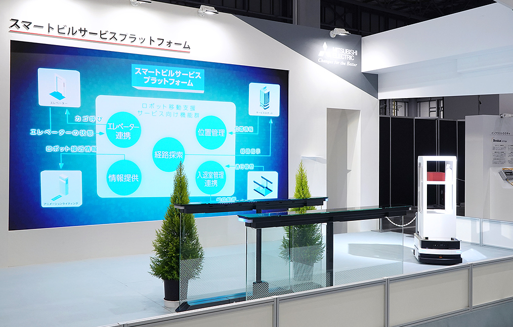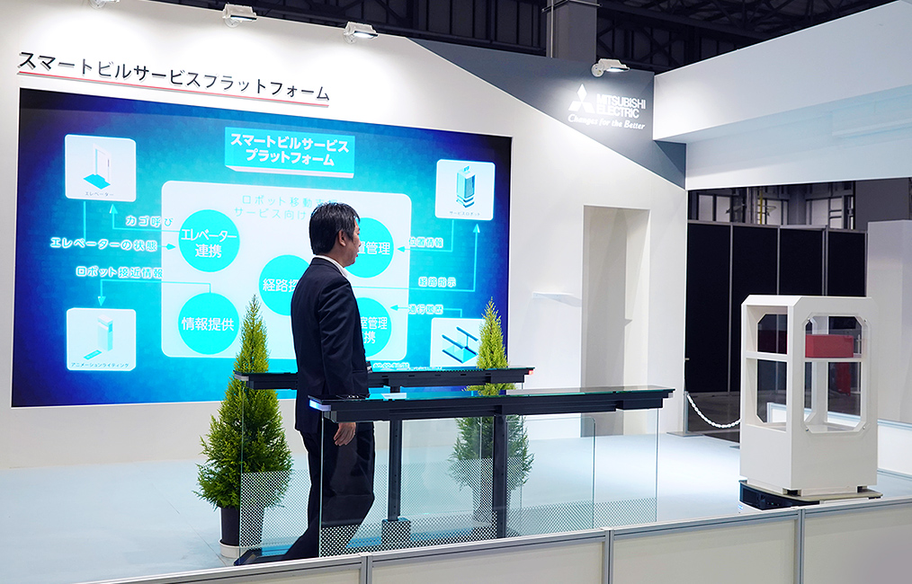 会場の最奥部に、三菱電機のブースを発見。今回は「ロボットのビル内移動を支援するプラットフォーム」を出展しているという。そのデモンストレーション中ということで、人だかりができていた。