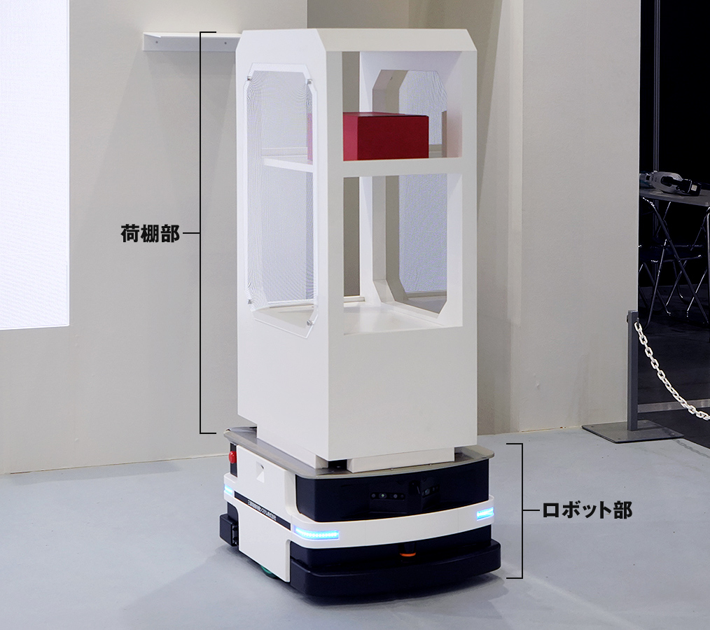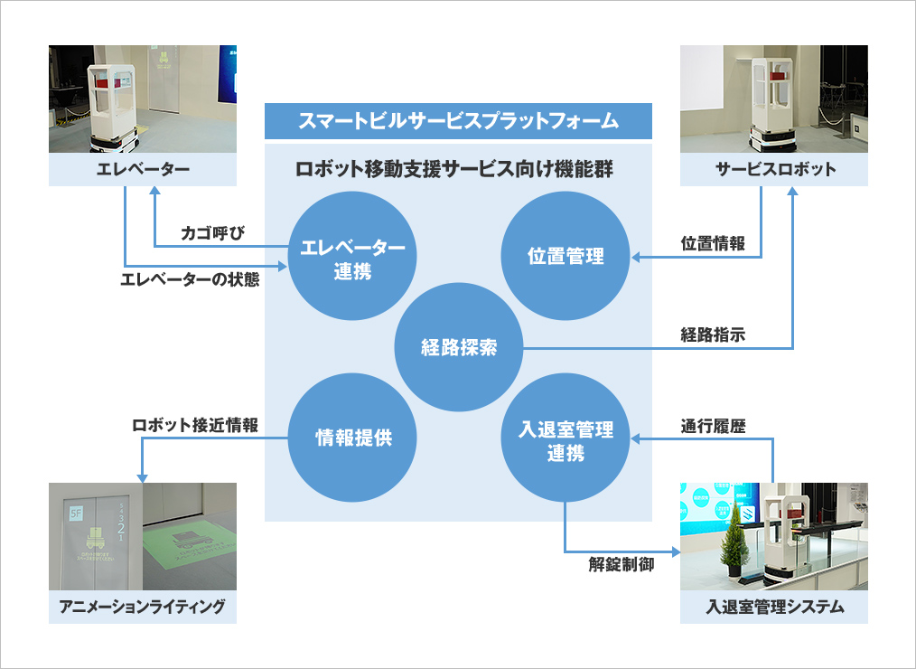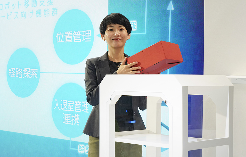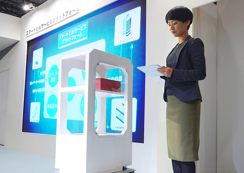 先ほどのステージでの説明によると、「スマートビルサービスプラットフォーム」がロボットの移動を支援しているのだという。つまり、「スマートビルサービスプラットフォーム」がセキュリティーゲートやエレベーターの状況を把握したうえでその時点での最適なルートを選択。また、人の接近を検知した際のロボットの回避行動を促すこと、エレベーター前での人への案内表示などを可能にする。