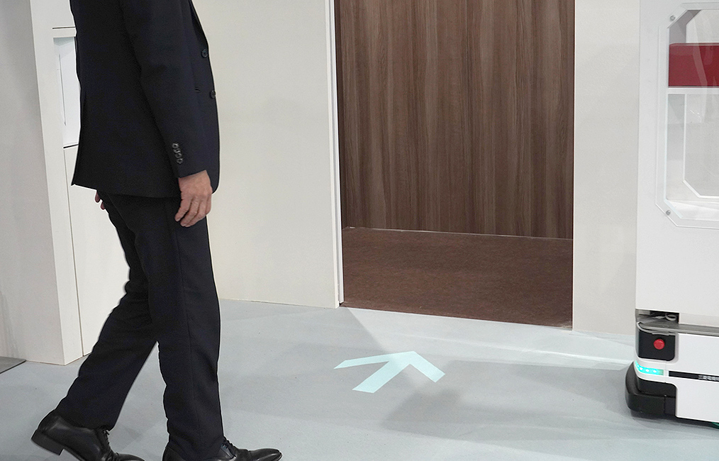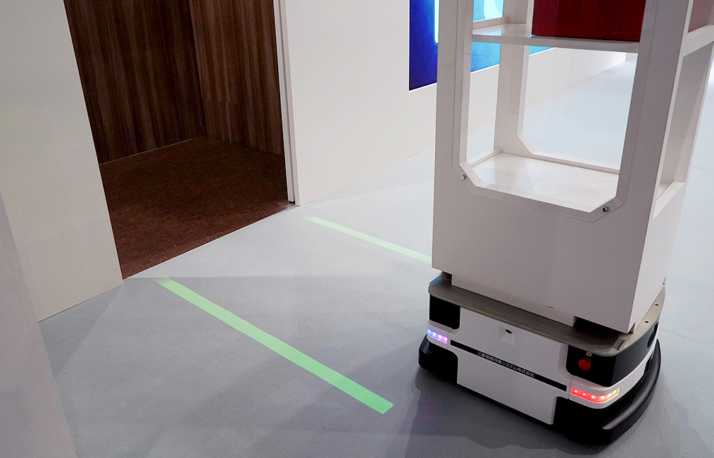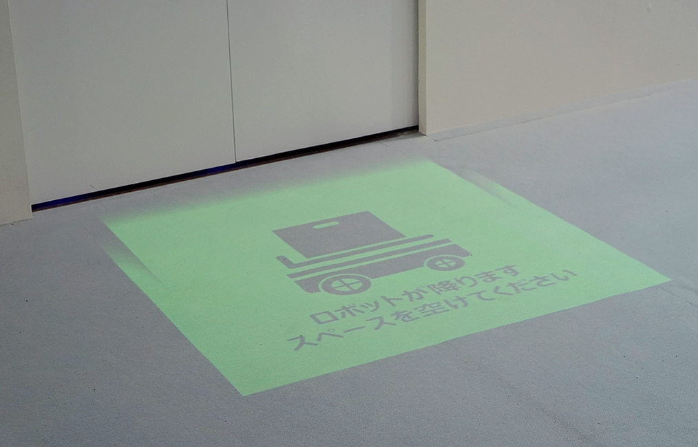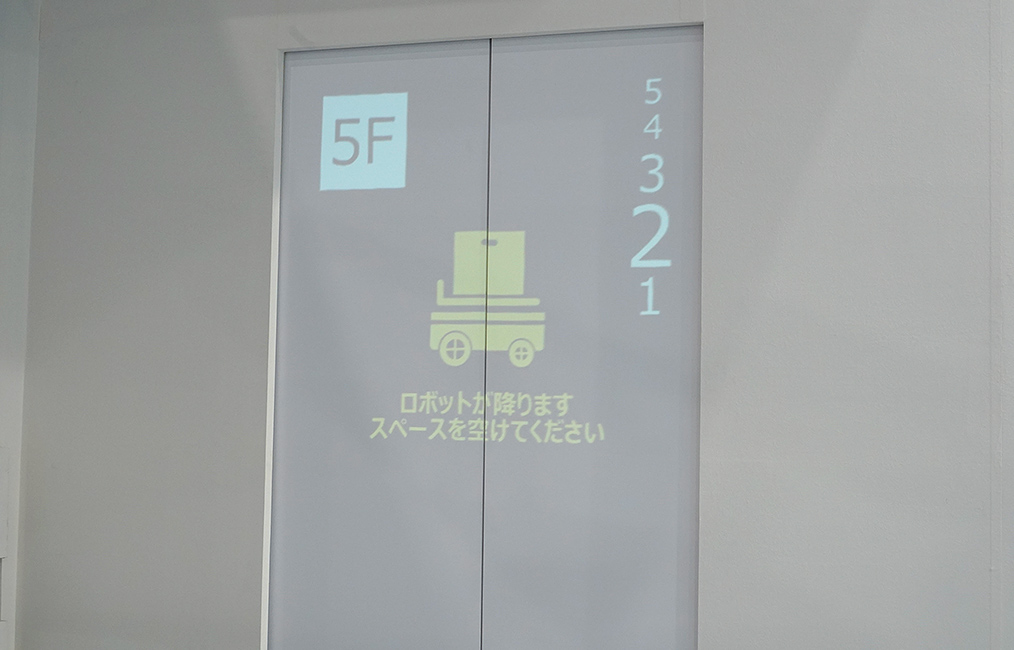 エレベーターが到着する前、目的フロアの床とエレベーターの扉には、ロボットの到着を知らせるサインが表示された。これも同じく人とロボットが共存しやすくするための工夫の一つで、乗り込む人間が出合い頭にロボットとぶつかるなどのトラブルを避けるためだという。