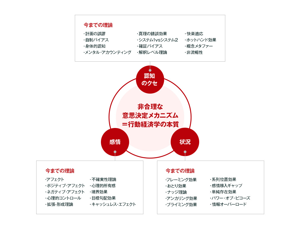 このように、人がついつい「非合理な意思決定」をしてしまうメカニズムには3つの要因があり、これまでの理論も3つに分類できます。こうすることで、これまで混沌としていた各理論が整理・体系化でき、行動経済学の本質を導き出せたと考えています。