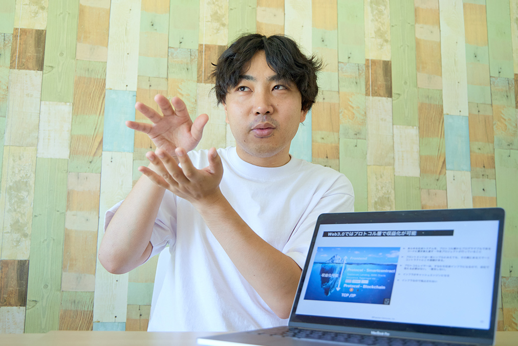 フロントエンドの下のプロトコル層における基礎的なコードが収益を上げるというのは、既に世界規模で起きています。実際にEthereumの開発時にはこのコンセプトによってスマートコントラクトを組み込んでいるため、現在の時価総額は約32兆円(取材当時)ですが、この規模の仮想通貨がグルグル動く度に、ものすごい金額が開発者の元には流れています。今はWeb3の時代ということで、年齢や性別、国・地域問わず、この世界への参入が引きも切らないわけですが、その人達が、「自分たちもこのコードを使ってみたい」と組み込むと、ますますお金は回ります。