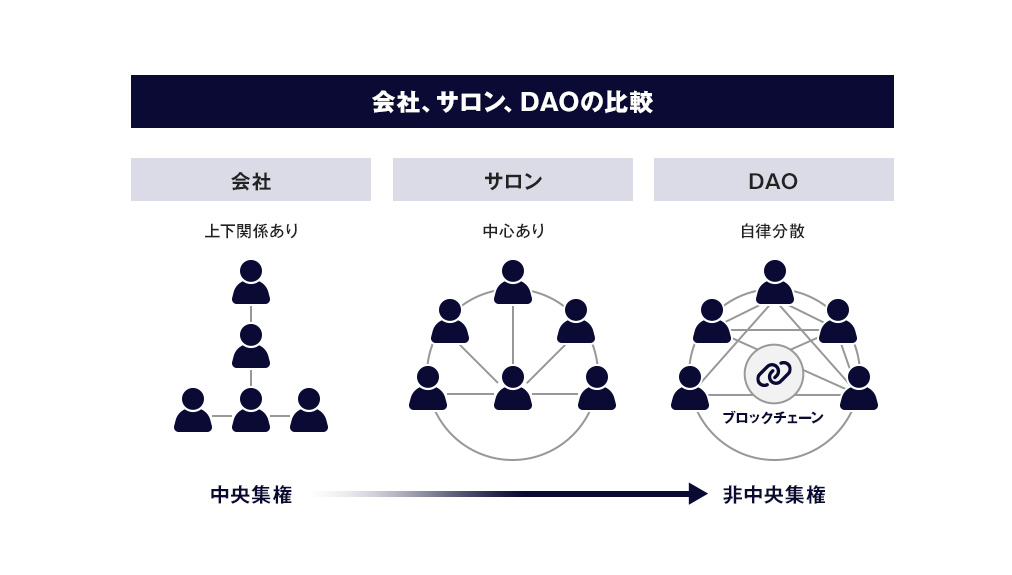 もう少しわかりやすいように、対比するものとしてサロンを考えます。サロンでは、主に主催者の下にサロン生が集って学び合うことが活動の主体です。ミッションドリブンのコミュニティとはいえますが、中心にいるのは主催者です。サロンの売り上げも主催者に入るのが一般的です。DAOでは、中心には誰もいないので、お金をどう使うかは全員に委ねられます。多数決などの方法が取られ、特定の個人の意図には従いません。