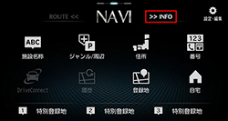 「NAVIメニュー画面」の『>> INFO』をタッチしてください。