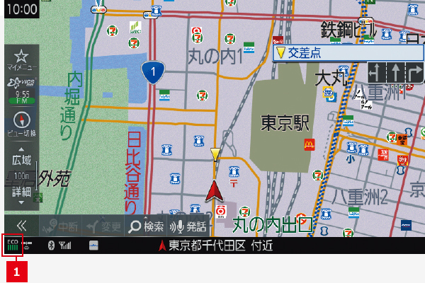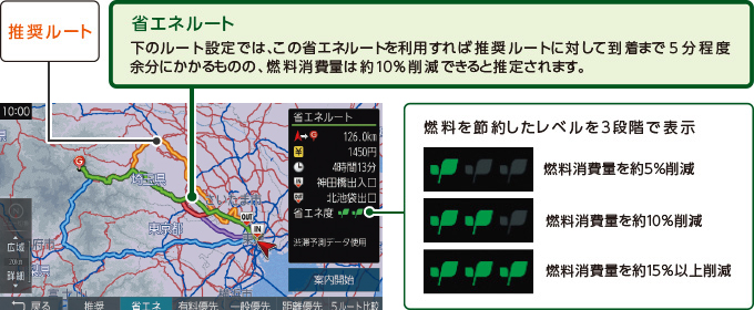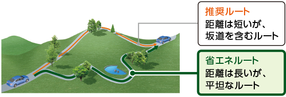 5ルート探索で[省エネ]を選択すると、ルートの距離だけでなく渋滞予測情報や道の勾配、信号の数などさまざまな項目を総合的に判断して燃料消費量が最小となるルートを探索します。