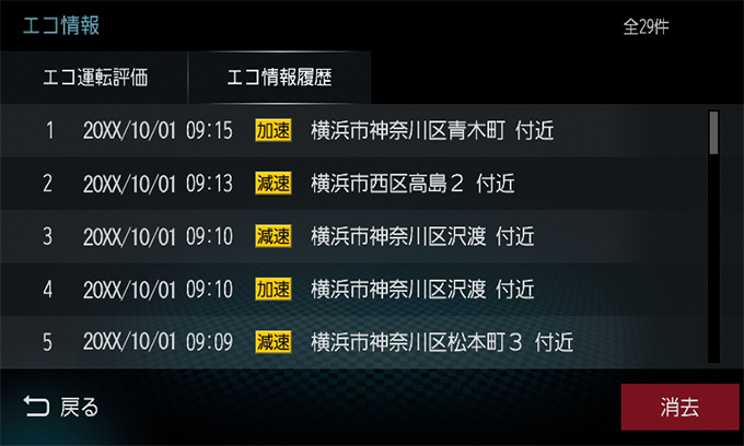 急発進や急ブレーキなどの運転履歴を地図上に記録(最大100件)。