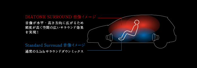 「DIATONE SURROUND」は、DVD5.1chサラウンドソースに効果を付加する機能です。フロント+リア4ch構成のシステムでは、「Standard Surround」の4chダウンミックス再生に対し、DIATONEオリジナルの拡張技術を付加。フロント2ch構成のシステムでは疑似5.1ch再生で前方スピーカーのみで360度全方向から包み込まれるようなサラウンド再生を実現します。信号処理には高音質なFIR処理を全面的に採用。リアルで緻密なサラウンド音質を達成しました。どちらのシステムでも違和感がなく水平、高さ方向で、リスナーの目前に広大な音場を創出し、臨場感と迫力に満ちた再生を楽しむことができます。