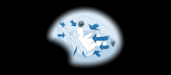 従来のハイエンドカーオーディオでは、最高の音場を得るためにはリスニングポイントを運転席など特定の座席に限定してセッティングする必要がありました。しかし運転席ではベストであっても、助手席や後部座席にとっては定位感が希薄で、感動的な音楽体験は望めません。「PremiDIA Real Position」は、複数の乗員がいてリスニングポイントがどこであっても、良好な定位感を実現します。前方座席では左右どちらのリスナーに対しても、目の高さまで音像が上がり、ボーカルが目の前で歌っているような定位感と広いステージングを再現。後部座席のリスナーには、フロントガラス方向がステージのように感じさせる音場で音楽を楽しむことができます。また音場の定位感を調整することも可能です。