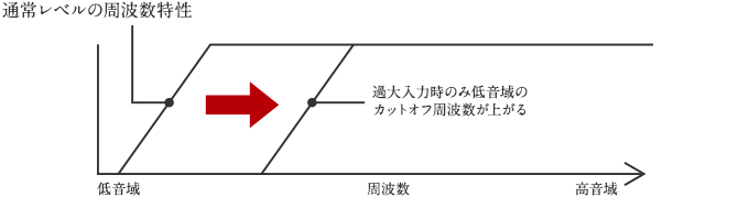 通常の音量では低音域信号をカットせずに迫力のある低音を再生し、大音量の超低音域信号が入力された場合のみ低音域信号をカットするDIATONEの独自機能です。スピーカーの振動板が大きく振幅することによって発生する歪みを抑制し、他の周波数帯域に対する影響を防ぐことで通常音量での低音域の量感と全帯域に渡る音の質感を両立させています。