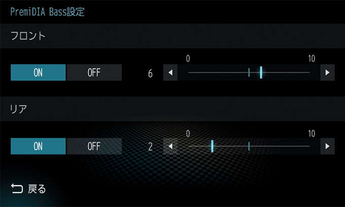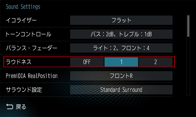 ボリュームを下げているとき、不足しがちな低音・高音を増幅する機能です。効果の大小、効果OFFを選択できます。