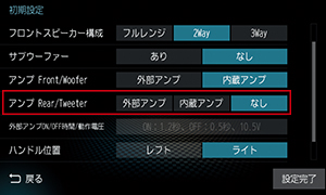オーディオの初期設定にあるリアスピーカー用のアンプ設定で、従来の「内蔵アンプ」「外部アンプ」に、「なし」を追加しました。リアの信号自体をミュートするので、内蔵アンプが動作せずノイズが低減されます。リアスピーカーがない車種やリアスピーカーを使用しない場合に役立ちます。