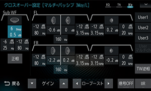 音質補正機能として一般的なバスブーストは低音域全体を強調する機能で、再生信号そのものを補正します。サブウーファー装着時にバスブーストを使用すると、強調されたウーファーの低音域とサブウーファーの低音域が干渉し、不自然に強調された低音となってしまいます。DIATONE SOUND. NAVIが搭載する「ローブースト」は、サブウーファー出力の超低音周波数帯域だけをなだらかに持ち上げる機能で、ウーファーが再生する低音域には影響を与えません。そのためウーファーとサブウーファーのつながりがよく、自然で量感が豊かな低音域再生を楽しめます。特に、ナチュラルで質感と量感に優れた低音域を再生するDIATONEのサブウーファーSW-G50と組み合わせたときに効果的な低音域補強を実現。量感を維持したまま深く沈み込んだ低音域調整が可能です。効果の強さは12段階で調整できます。