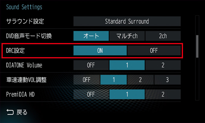 DVDの再生時に、フルレンジの標準スピーカーでも整った音声バランスで再生が可能なDRC(ダイナミックレンジ圧縮)を設定できます。