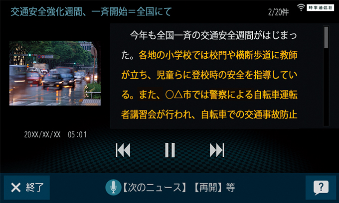 音声による操作だけでニュース情報を得ることができる「ニュースリーダー」を搭載。時事通信社から提供されるニュースを、三菱独自のAIが重要な文を抽出し、走行中でもわかりやすい長さに要約して読み上げます。ニュースの読み上げ中でも割り込んで音声操作ができるので、走行中でも興味があるニュースをすばやくスムーズに選択することが可能です。