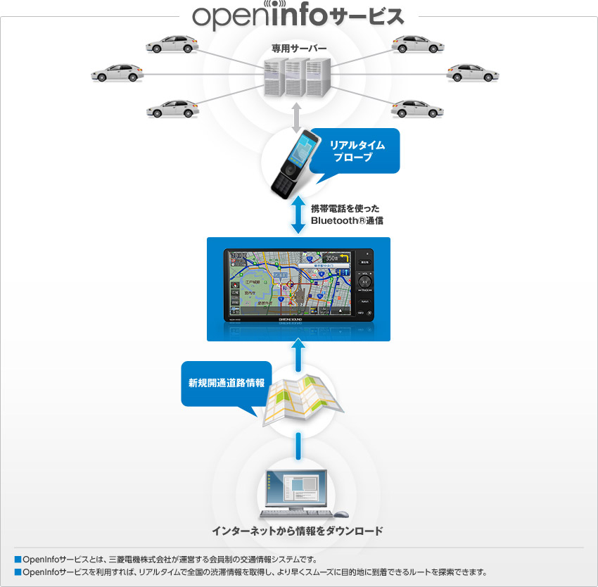 • OpenInfoサービスの利用には三菱電機製カーナビゲーションの他にBluetooth機能を内蔵した携帯電話が必要です。