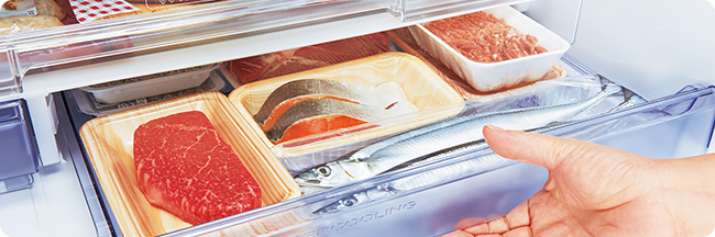その名の通り、氷点下で食材を保存する「氷点下ストッカーD A.I.」は、新鮮なお肉やお魚を生のまま約3~10日もおいしく長持ちさせます。氷点下なのに凍らないのは、「切れちゃう瞬冷凍」と同じ過冷却現象を応用しているから。冷凍しないので取り出したらすぐ、新鮮なままおいしく調理できます。さらに長期間保存したい場合は、「切れちゃう瞬冷凍 A.I.」を利用しましょう。食材を凍ったまま切り分けられるので、必要な分だけ使い、残りをまた瞬冷凍しておくこともできます。