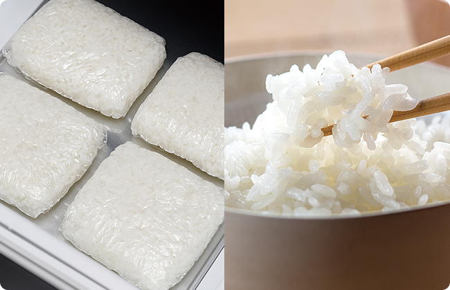 一方、時間がないときやごはんが足りなくなったときに、何かと重宝するのが冷凍ごはん。三菱IHジャー炊飯器「本炭釜 KAMADO」には、この冷凍ごはんをよりおいしく炊ける「まとめ炊き(冷凍用)モード」を搭載しています。甘みを引き出し芯までみずみずしく炊き上げる本モードでは、冷凍しても炊きたてと変わらないお米の粒感と甘みを実現。冷凍ごはんを作り置きしておけば、レンジでチンするだけでいつでもおいしいごはんを楽しめます。忙しい朝のお弁当作りもサポートします。