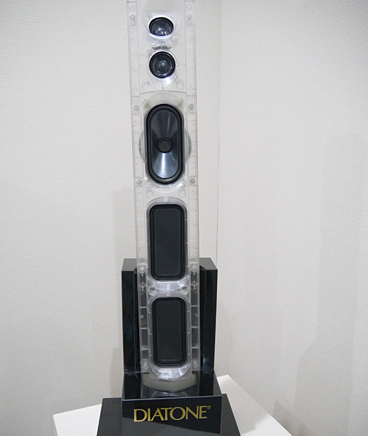 説明員:はい。「REAL 4K」では、DIATONE技術の結晶である特殊素材NCV※3スピーカーユニットと大型パッシブラジエーターを、円筒型のスピーカーボックスに搭載しています。ハイエンドオーディオにも引けを取らない、大迫力のサウンドをぜひ体験してみてください。