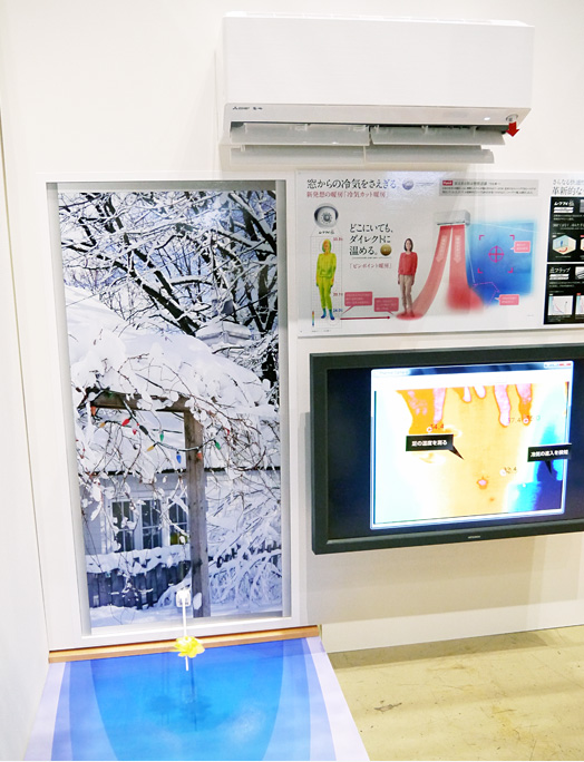 説明員:エアコンの約8割は窓際に設置されています。そしてこの窓からの冷気がお部屋の温度を下げてしまい、暖房効率を低下させる要因なんです。そこで「霧ヶ峰」では、お部屋を360°見張り、窓からの冷気がお部屋に入るのを温風でカットしつつ、同時に足元へのピンポイント暖房を行う機能を搭載。これも「匠フラップ」があるからこそ両立できる機能なんです。