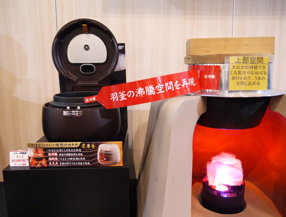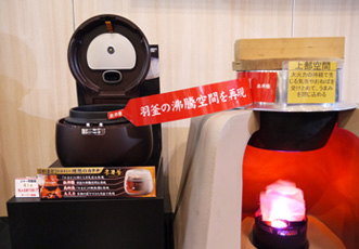 説明員:もっとも差が出るのは食感です。かまどで炊いたごはんは、お米に含まれる水分が多いのに食感はかため。一方、通常の炊飯器で水を多めに炊くとやわらかいごはんができてしまいます。含水量を高めてかたく炊き上げるにはどうしたらいいか。その課題に挑戦したのが、「本炭釜 KAMADO」です。