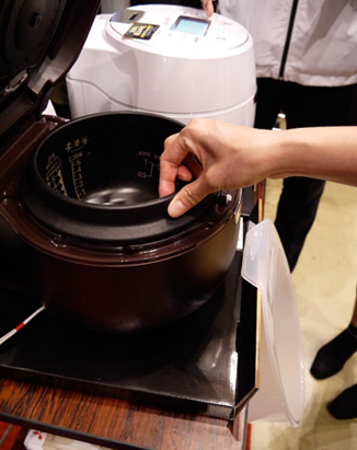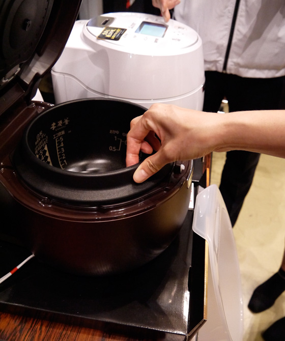 説明員:はい、そこは外せません。炭はIHととても相性がよく、他の素材とは比べものにならないほど磁力線が深く浸透するのが特長。最大10mmの厚さを持つ炭釜全体が一気に発熱体となるので、お米のひと粒ひと粒に熱が行き渡るんです。かまどごはんのような大火力の再現は、炭釜だからこそ成し得たといえます。