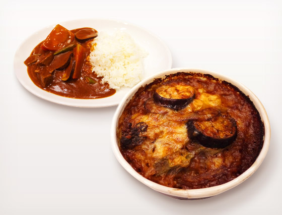ステージで完成した「トマトとなすとオクラのカレー」と焼きカレー。