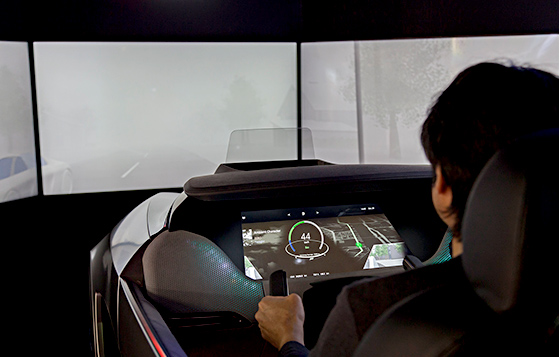 試乗体験では、この後、視界の悪い霧の中を走行。自動運転から手動運転に切り替えます。切り替えるときに顔認証をしたカメラが運転者の状態を判断します。(自動運転なので)居眠りをしていたり、よそ見をしたり、ハンドルを握っていないときには手動運転に切り替わりません。