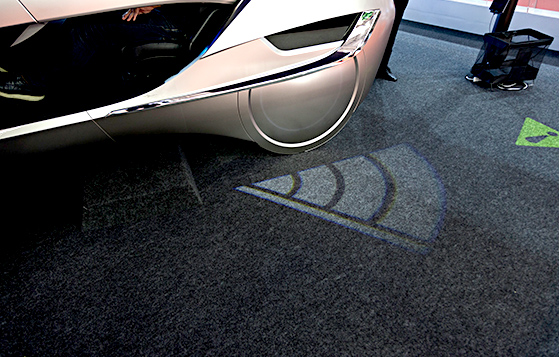 そうこうしているうちに試乗プログラムが終了。ドアを跳ね上げ、外へ出ますが、このときもアニメーションライティングが表示され、後ろから来るバイクや自転車に注意を促します。短い時間でしたが、運転する楽しさを損ねずに高度な安全性を実現できていることが実感できました。