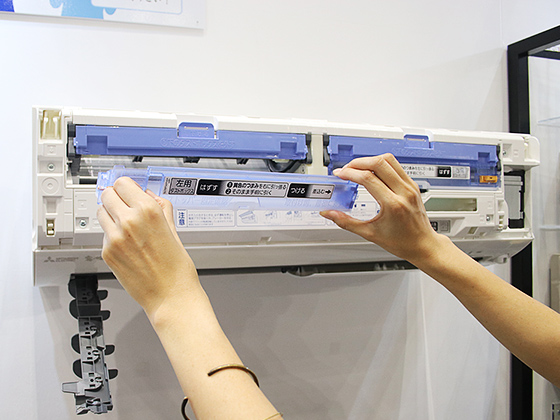 左右のフラップを開いて通風路の中までおそうじできる「はずせるボディ」。「フィルターおそうじメカ」も外せるため、お手入れも簡単です。