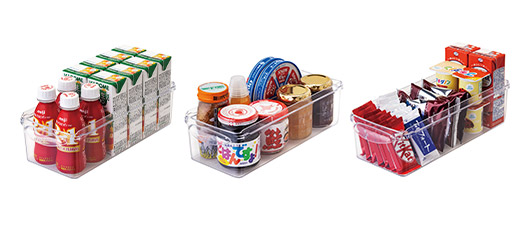 バラつきやすい小さな物や、よく使う「朝食セット」、「おやつセット」等をフリーケースにまとめておけば、サッと取り出せて便利。食材を探す時間も短縮できるため、省エネにも繋がります。
