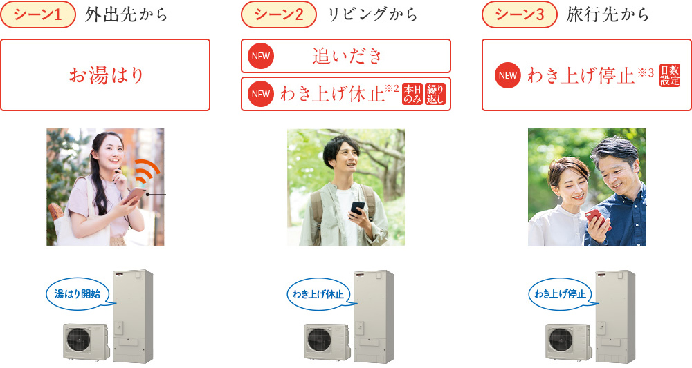 ・旅行に出発してからでも、わき上げ停止日数設定でムダ削減の設定をかんたんに。