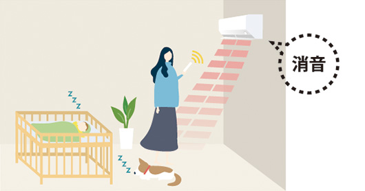 リモコン操作時に室内機から受信音を消す「消音モード」を搭載し、乳幼児の就寝中や音に敏感なペットがいる環境など、音に対する配慮が必要な場面でも周囲を気にせず静かに操作できるようになりました。