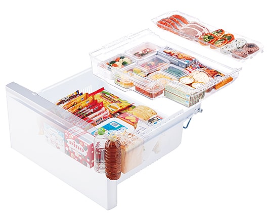 また、「WZシリーズ」は冷凍室が真ん中で見わたしやすく取り出しやすくなっております。冷凍室が3段構造となっており、カップアイス、保冷剤、冷凍ごはんなどの小さなものも整理しやすくなっています。