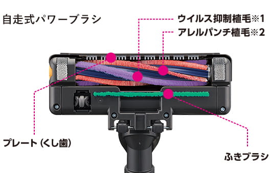 植毛に、ウイルス抑制加工(紫色)とアレルパンチ加工(赤色)を採用。清潔を保ちながらお掃除をすることができ、回転ブラシをお手入れする際も安心です。