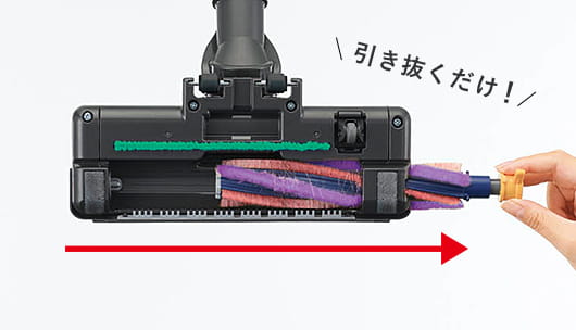 吸引力の低下につながる毛のからみも、回転ブラシをサッと引き抜くだけで簡単に除去でき、お手入れのわずらわしさを軽減します。