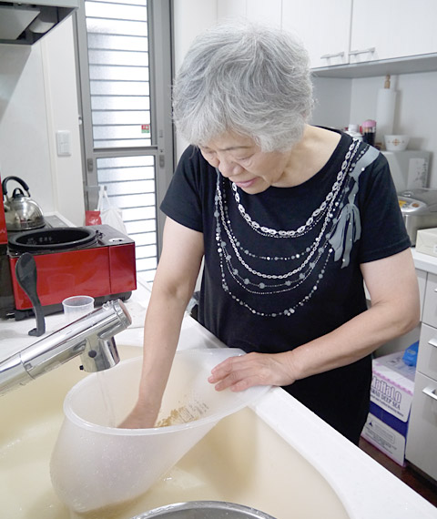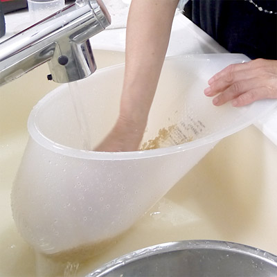 乾燥したお米は研ぎ始めに一気に水を吸収します。研ぎ汁に含まれる不純物を吸収させないためにも、水はけの良い状態で解くことが重要!