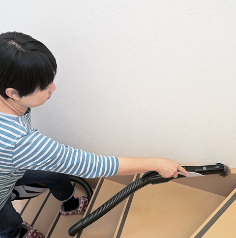 壁の高い位置の角…ほうっておくと意外とホコリが付いてしまうので、ノズルをさっと外して付け替えて、手軽に掃除ができるのが良いです。