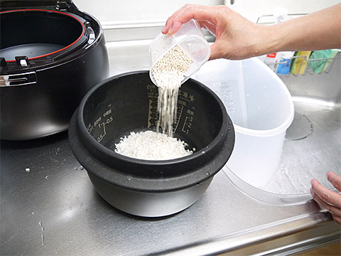 計量カップで、お米の量を正確に計って、お水の量も内釜の「麦飯」の水位線に合わせてしっかりチェックするのがポイントです。麦は水加減したあとに加えます。