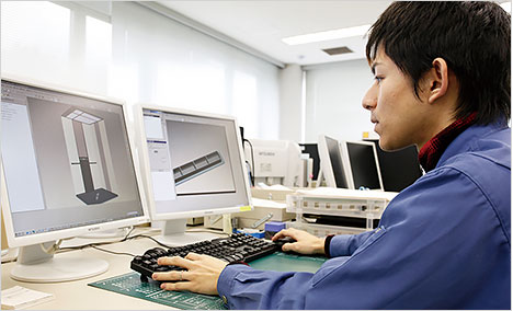 - ここでは、ホームエレベーター内の電子機器を加工しています。組立が完了した製品は、このようにパソコン上でシミュレーションを行い、不良品の流出防止に努めています。
