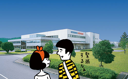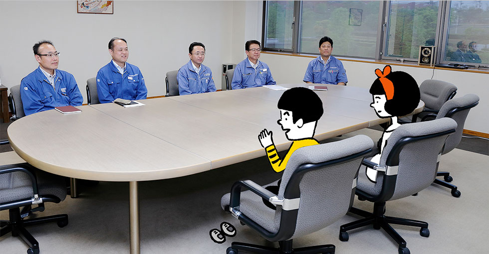 - それでは、おふたりさん、この扉の奥へ。最後は、弊社の幹部、工場五人衆から会社の取り組みなどについてご説明させて頂きます。では、私はここで失礼いたしまーす!