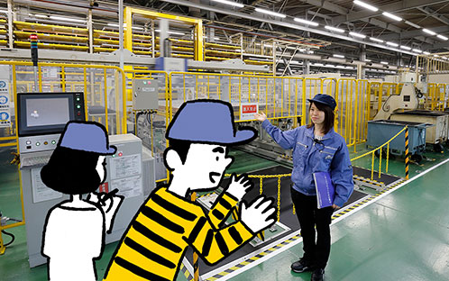 - こんにちは、今日、工場を案内させていただく、業務課の原田と申します。