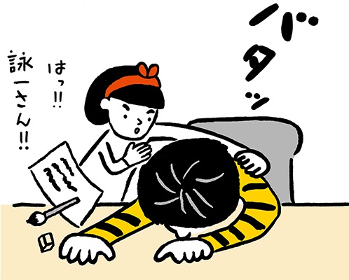 - ハイ!OK!ありがとうございますっ!バタッ・・・。(机に倒れる詠一)