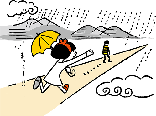 ・・・ん?外は霧雨ですね、山並みが水墨画に見える、濡れて帰ろう。(スタスタスタ・・・)