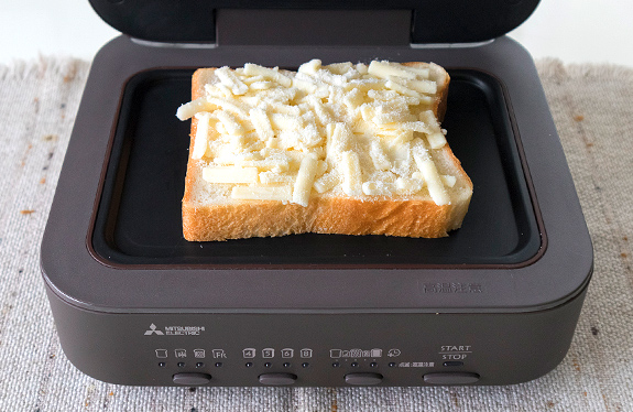 従来のトースターでは、ここまでチーズをとろけさせようとすると、6枚切りのパンはカリカリになってしまうんですよね。
