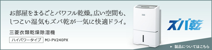 業界No.1※1除湿パワー、家中まるごとグングン除湿。お部屋のすみずみまで快適に!※1MJ-PV240PXの場合(除湿能力24L/日)。2019年3月8日現在。家庭用衣類乾燥除湿機において。