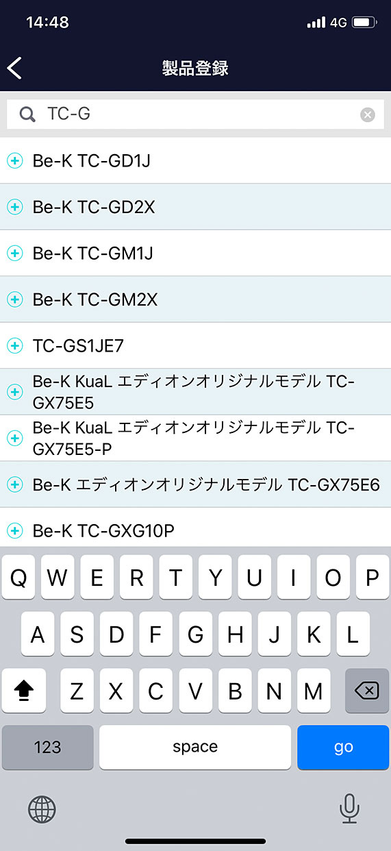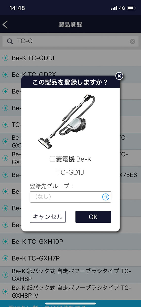そして次は、掃除機(三菱掃除機「Be-K TC-GD1J」)を登録してみます。型番の最初の4文字「TC-G」まで入力したら、候補が表示されたので選択して・・・登録!型番をすべて入力しなくても良いのは便利ですね。さあ、これでいざという時、取扱説明書を探さなくてもスマホですぐに読めようになりました。