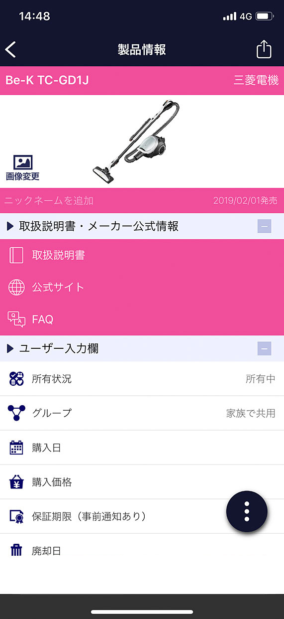 これなら簡単、と調子にのって家中の家電製品も次から次へと登録してしまいました。ユーザーが追加入力できる項目も充実しているので、購入日や購入価格、レシートや保証書、製品の写真なども記録できてさらに便利です。わが家の家電製品アルバムができちゃう。