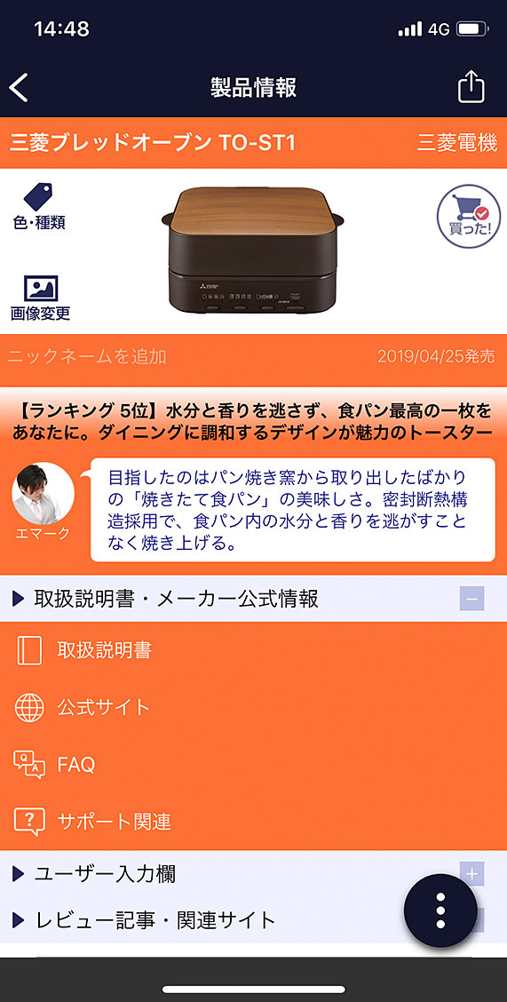 取扱説明書だけじゃなくてFAQやサポート情報にもすぐアクセスできるのは便利。ネット上の製品レビューも一覧で読めるので、家電の購入を検討しているときに役立ちそうですね。