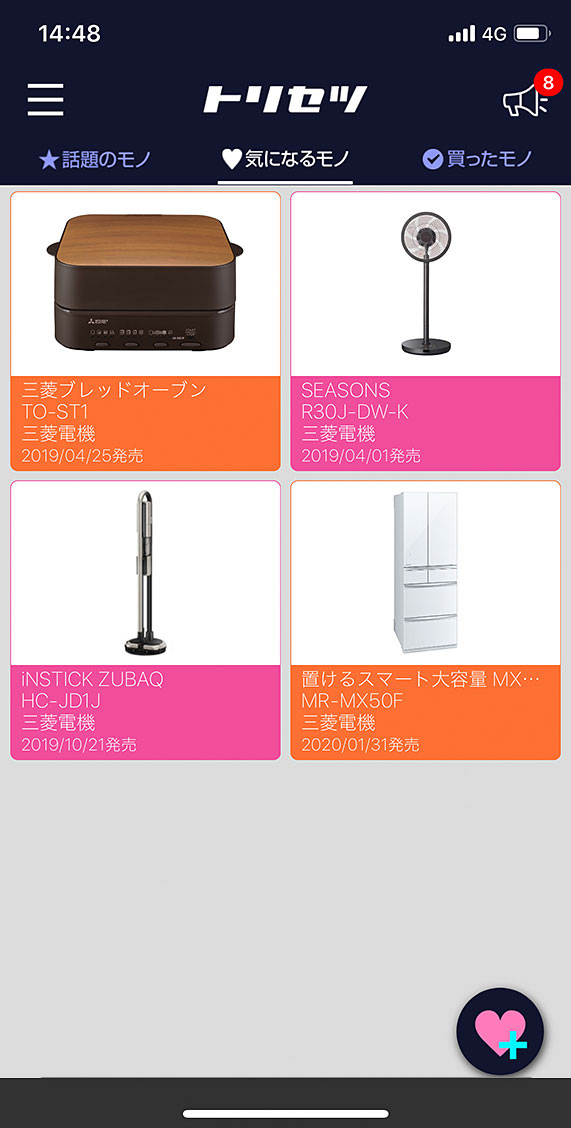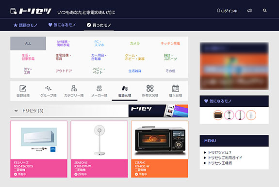 いつも何かしら気になる家電がある私。この「トリセツ」で面白いな!と感じたのは「★ 話題のモノ」、「♡ 気になるモノ」、「✓ 買ったモノ」の3つのタブがあること。