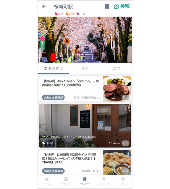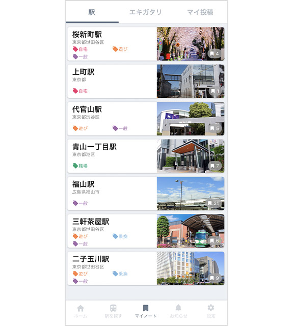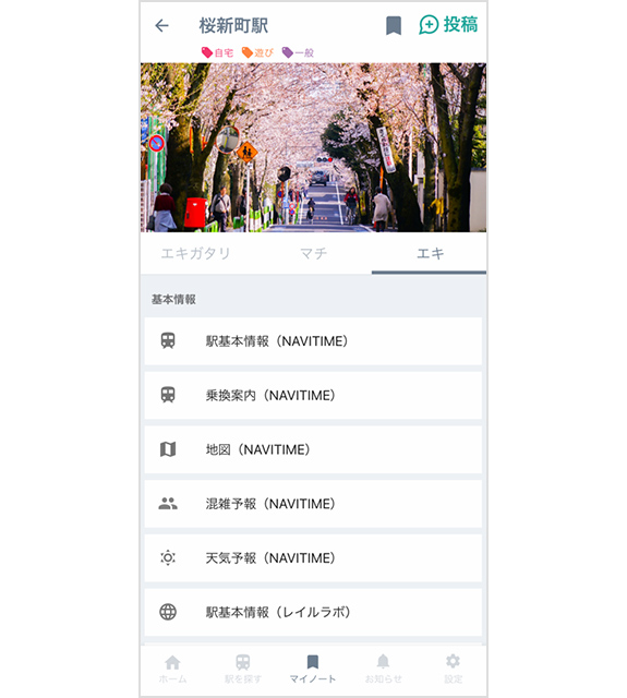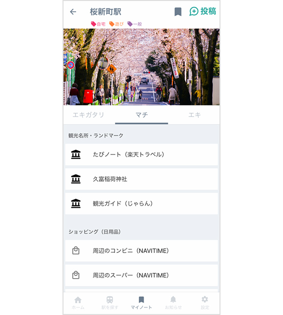 マイノート機能では、駅や記事をブックマークでき、駅にはタグを付けることもできます。私は先ほどの自宅の最寄り駅に、「自宅最寄」と「遊び・買い物」「家族・親族最寄」のタグをチョイス。ほかにも「いつか行きたい」や「職場最寄」など、便利なタグが用意されていて、目的に合わせて使い分けられます。