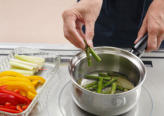 梅雨のジメジメに体力消耗気味の編集部員Yが挑戦するのは、さっぱりとした「夏野菜のピクルス」です。白ワインビネガー、水、砂糖を混ぜたピクルス液を中火で煮立て、グリーンアスパラガスやパプリカなどの夏野菜を入れて茹でます。